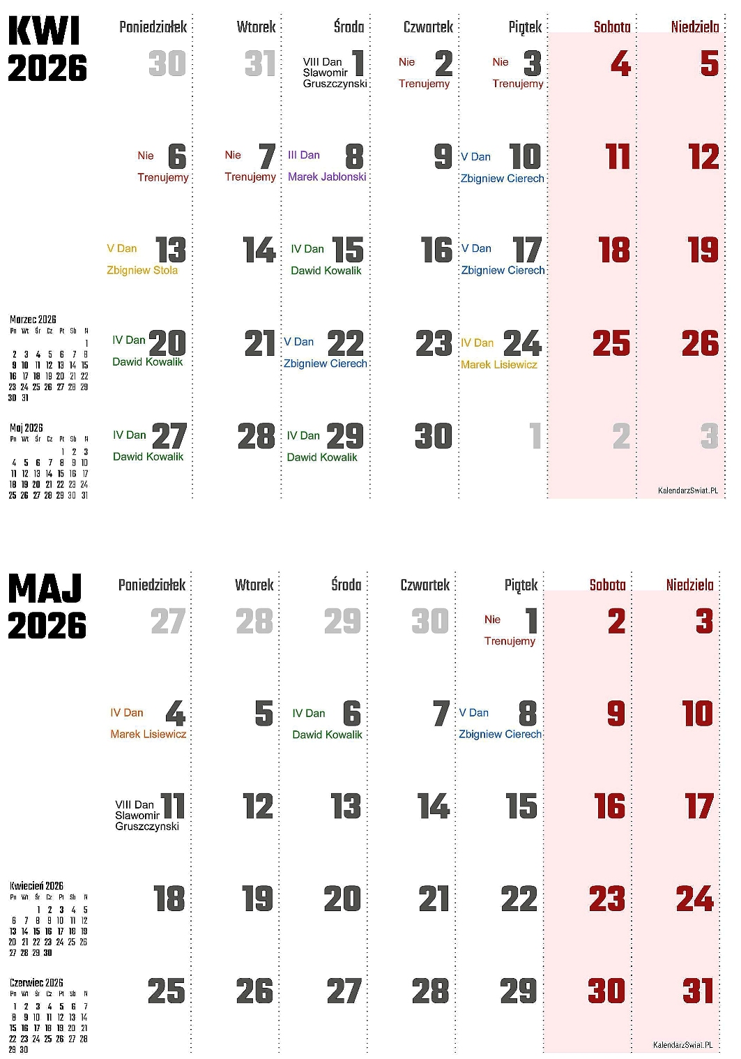 TRENINGI W KWIETNIU I MAJU 2026 Posted on 26 marca, 202626 marca, 2026 by gruszka1967-admin Ze względu na urlop mistrza Sławomira Gruszczyńskiego przedstawiamy plan zastępstw w kwietniu i maju 2026 roku. Zachęcamy ćwiczących do skorzystania z bogatej wiedzy i umiejętności naszych instruktorów.
